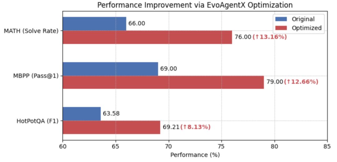 实验结果显示,EvoAgentX 在多跳问答(HotPotQA)、代码生成(MBPP)和数学推理(MATH)三类具有代表性的任务中均实现了稳定且显著的性能提升,平均提升幅度高达 8%~13%