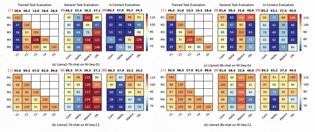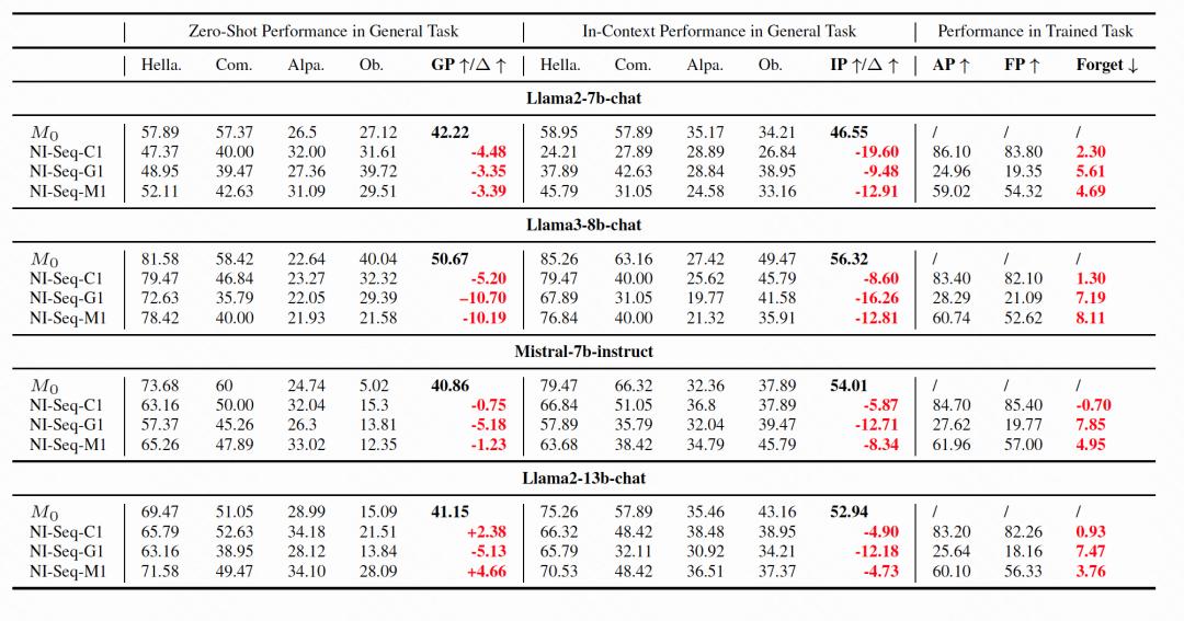 作者使用SuperNI数据集[1]构建六种任务序列,覆盖生成任务、分类任务以及二者混合任务,并且关注三个指标量化模型对不同能力的遗忘程度: