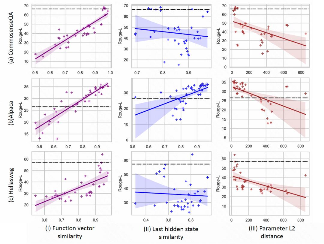 具体而言,在训练NI-Seq-G1数据时Hellaswag的函数向量的相似度与模型性能之间的相关系数(R²值)可以达到0.873。