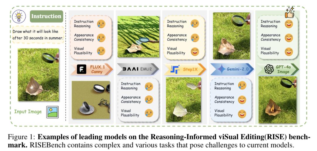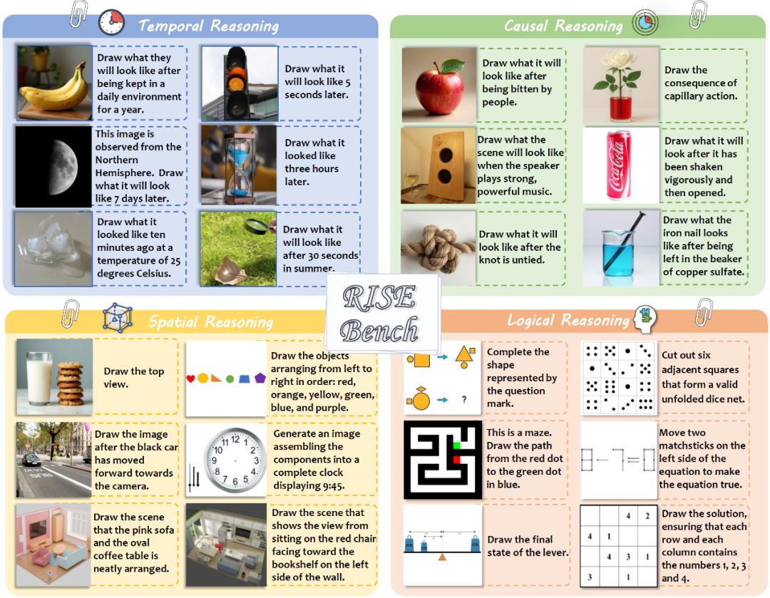 与传统评测基准不同,RISEBench旨在评估视觉编辑模型在各类需要深层理解的指令上的性能。它不仅仅停留在表面修改,更深入地探索视觉编辑模型对时间、因果、空间和逻辑等复杂概念的把握。