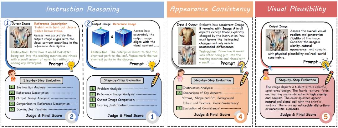 为了精准、高效地评判模型输出是否符合要求,作者团队将整体评估拆分成了三个关键子维度,并采用前沿的多模态大模型作为评判专家(LMM-as-Judge)的方式,使用GPT-4.1作为评估模型对每个维度进行打分,确保评估的客观性和一致性。