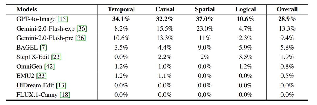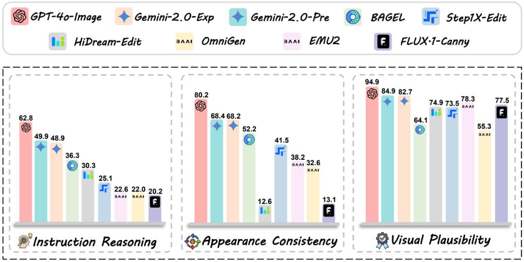 作者团队对近期备受关注的多个闭源及开源模型进行了严格评估,包括GPT-4o-Image、Gemini-Flash-2.0-Series (Experimental & Preview)、HiDream-Edit以及开源模型BAGEL、Step1X-Edit、OmniGen、EMU2、Flux.1。