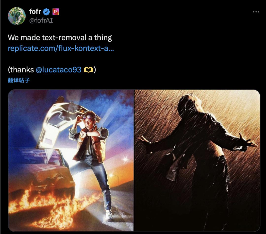 此外根据网友测试,FLUX.1 Kontext还可以删除文本,如把电影海报上的字全去掉。