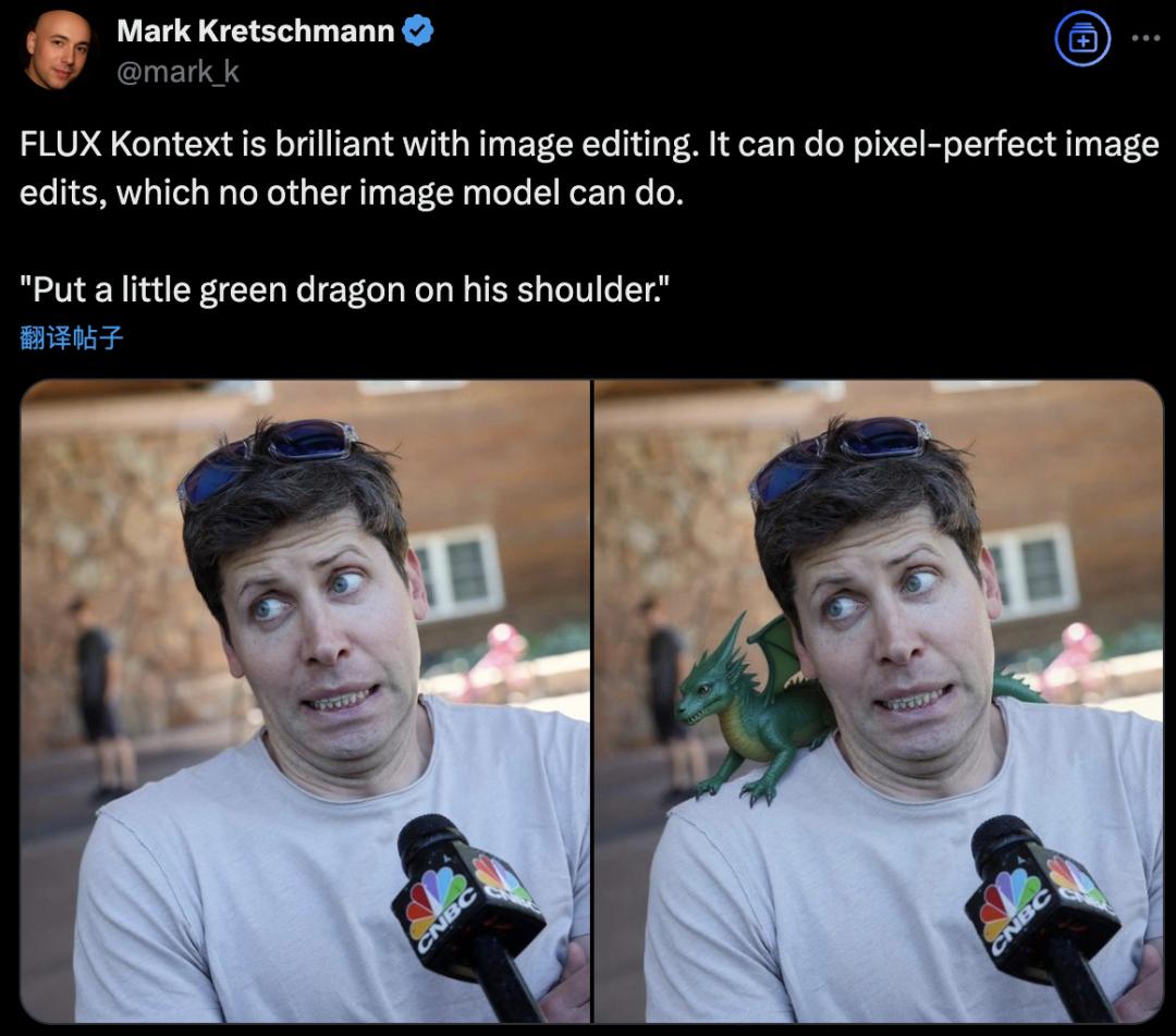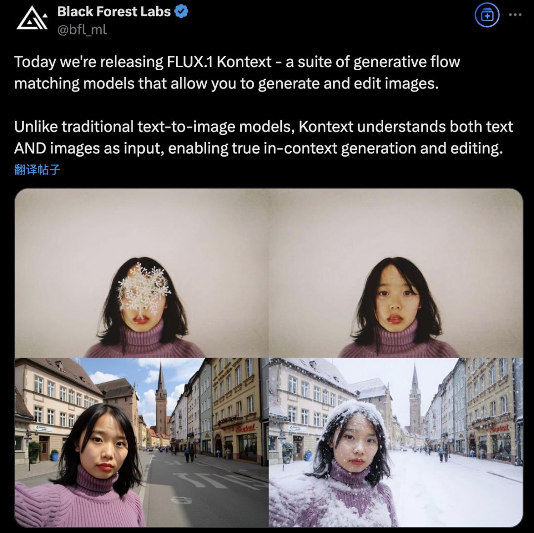 最来自之前很火的Black Forest Labs,官方表示这一次能做到真正的上下文生成和编辑。