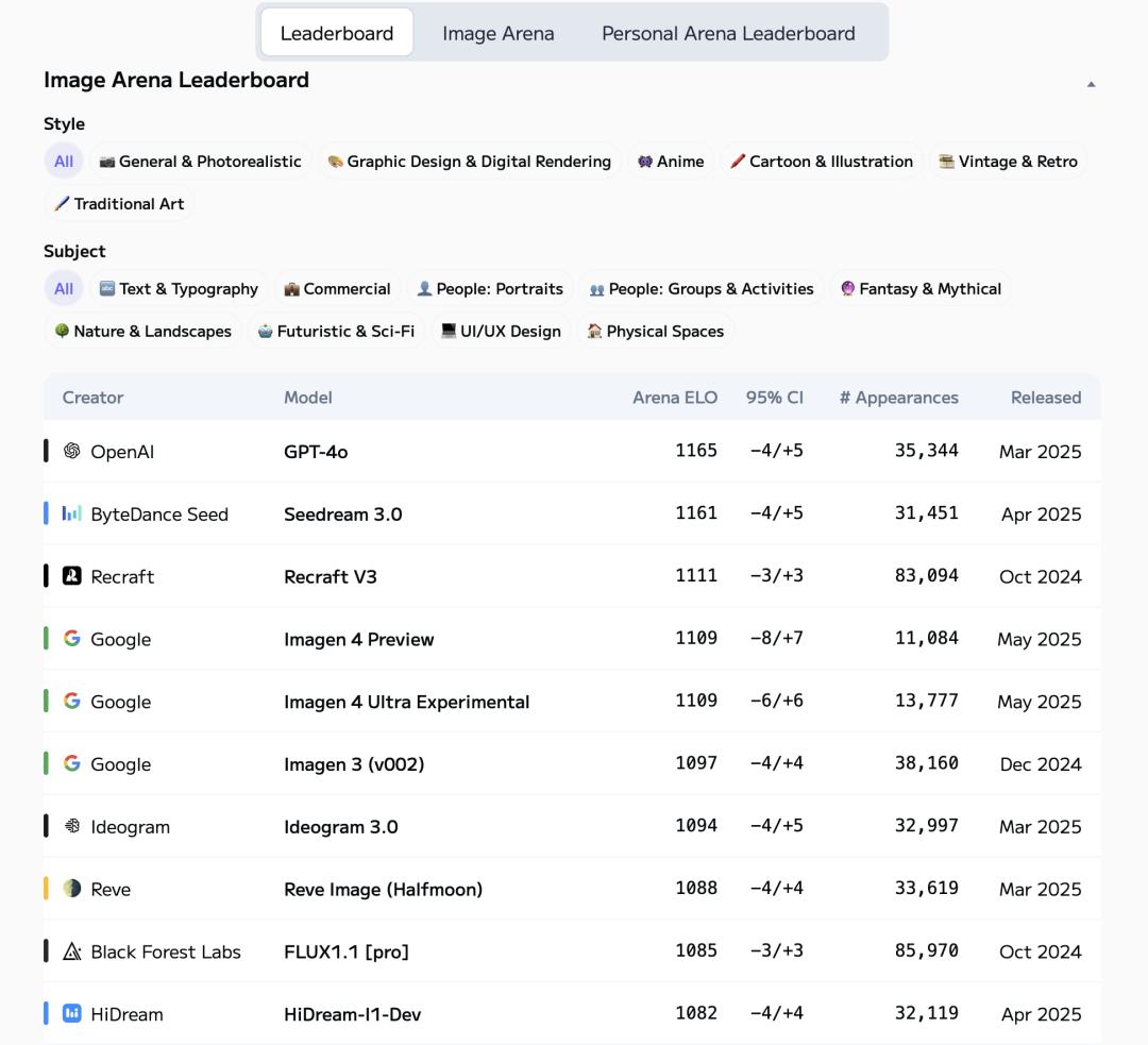 最后再来看一下文生图领域的格局,在AritificialAnalysis的排行榜上,GPT-4o、字节的Seedream 3.0和Recraft V3排名前三。