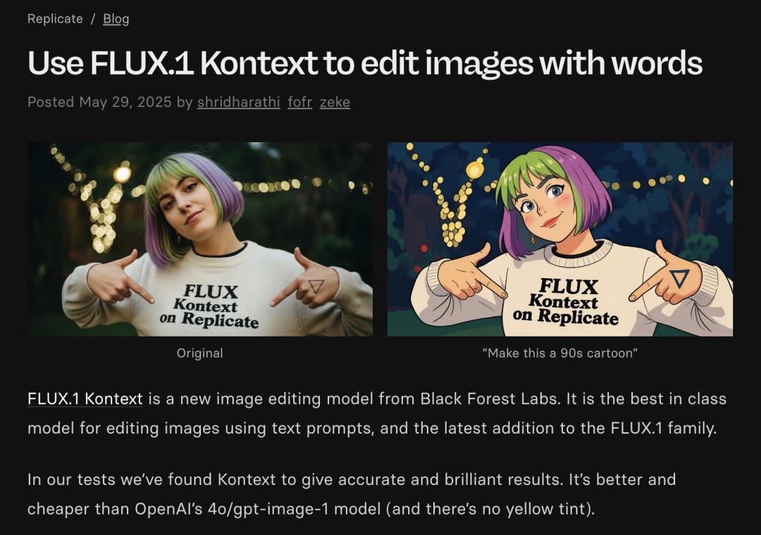 第三方平台Replicate对FLUX.1 Kontext做了详细测试,结论是比OpenAI的4o效果更好,还更便宜,图像也不会偏黄。