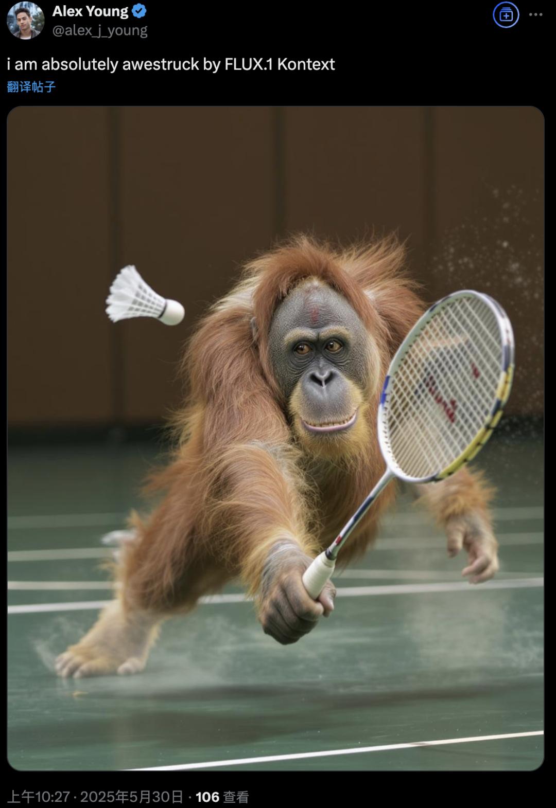 在生成能力上,有网友测试的猩猩打羽毛球细节也很丰富。