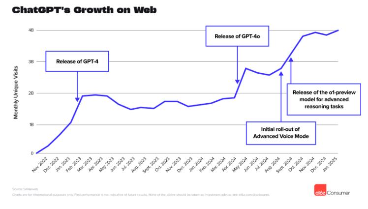 2024年8月,路透社报道称,ChatGPT的用户群已增至2亿。近期报道也提到,ChatGPT的用户群在6个月内增长了一倍,达到4亿。然而,ChatGPT仍然面临一个关键问题。尽管获得了巨额融资,但它仍需与现金流远超其的大型科技公司竞争。此外,ChatGPT也不具备Meta那样的网络效应。