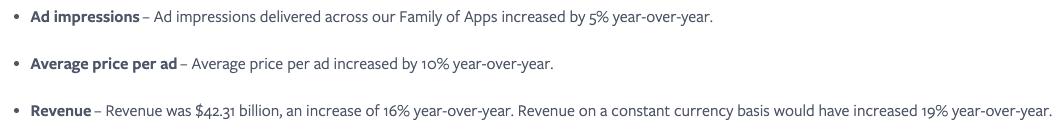 Meta (NASDAQ:META ) 近期的收益改善了人们对该股的情绪,因为该公司的收入和收益均大幅超出预期。每股收益为 6.43 美元,比预期高出 1.22 美元。近期收益中需要关注的关键指标之一是每条广告的价格。该指标同比增长 10%,因为广告商准备为更有针对性的广告支付更高的价格。