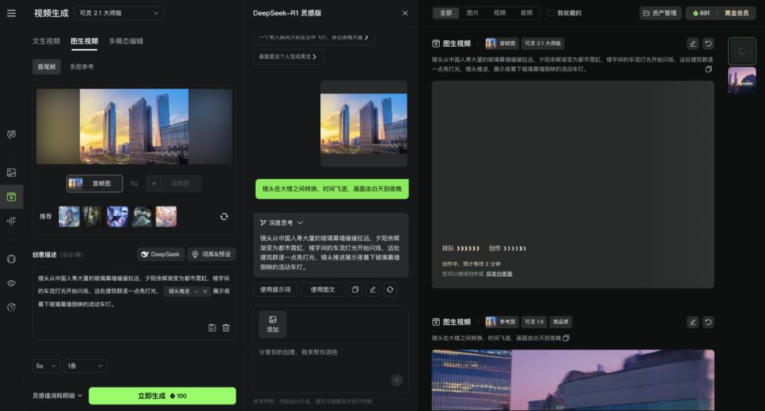 值得一说的是,可灵接入了DeepSeek-R1灵感版大模型,用起来更方便一些。再加上可灵刚发布了2.1版本,我就简单讲讲用完可灵的感受。
