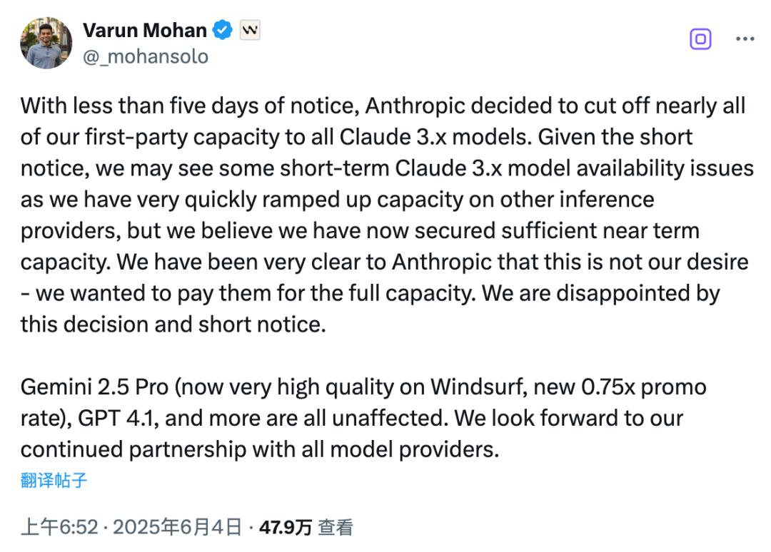 然而,今天一大早,Windsurf CEO Varun Mohan 在 X 平台上控诉 Anthropic 在不到五天的时间通知下,几乎全部切断 Claude 3.x 系列模型的第一方调用容量(包括 Claude 3.5 Sonnet、3.7 Sonnet 和 3.7 Sonnet Thinking)。