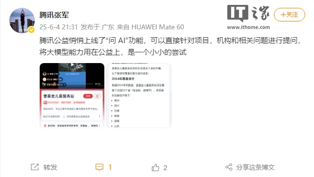 IT之家 6 月 4 日消息,腾讯公司公关总监今晚表示,腾讯公益悄悄上线了一项“问 AI”功能,可以直接针对项目,机构和相关问题进行提问,这似乎是腾讯首次尝试将大模型能力用在公益领域。