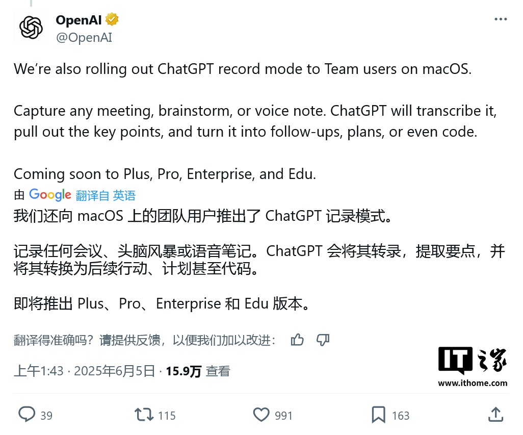 OpenAI 公司宣布自昨日开始,ChatGPT Team、Enterprise 和 Edu 用户在使用 Mac 版 ChatGPT 应用时,将看到提示工具旁新增的“录音”(Record)按钮。IT之家附上截图如下: