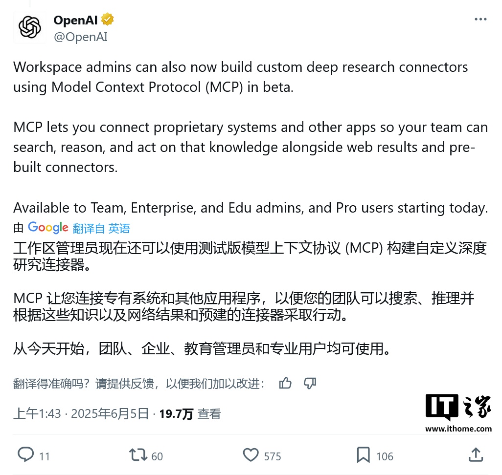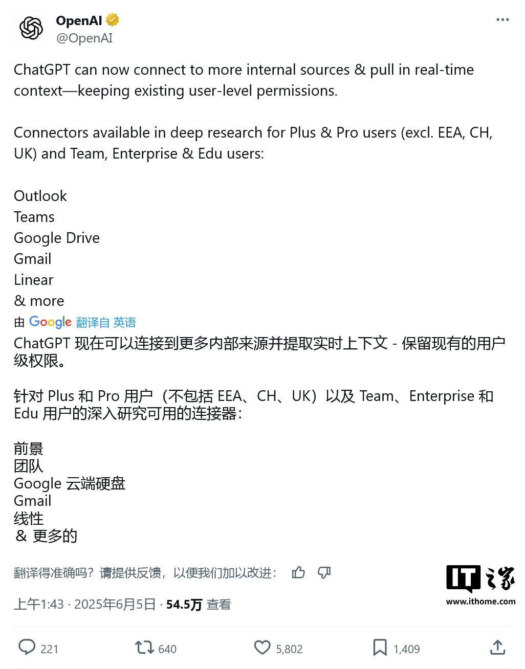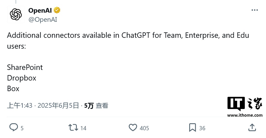 IT之家 6 月 5 日消息,科技媒体 9to5Mac 昨日(6 月 4 日)发布博文,报道称 OpenAI 公司重点服务于团队和小型企业,全力推动 ChatGPT 转型为真正的生产力助手。
