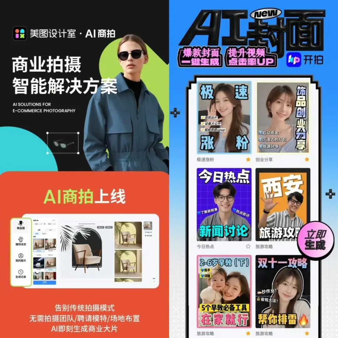 美图公司也提到,生产力工具是美图未来第三增长曲线。截至2024年底,AI驱动的在线设计工具“美图设计室”,其功能包括AI商拍、虚拟模特试衣、智能物料工厂等,目前付费订阅用户数113万,一年涨了26万,产品收入同比翻倍增长,并已经与淘系、微店等数十家电商平台建立合作。此外,聚焦口播视频创作的“开拍”月活数破百万。