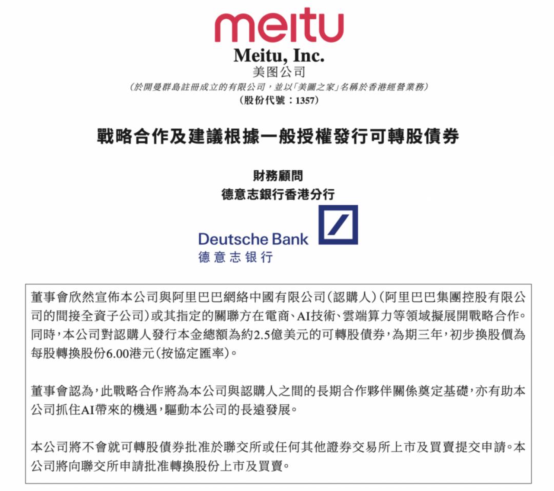 在资本层面,阿里以1%的超低年息认购可转债,转股价6港元较美图年初均价溢价24%。这种设计既为美图提供低成本资金,又让阿里获得潜在6.85%股权及董事提名权,转股完成后将成为美图重要股东。