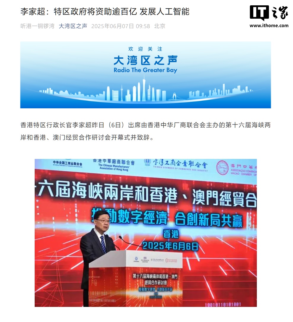 IT之家 6 月 7 日消息,据大湾区之声,香港特区行政长官李家超昨日出席由香港中华厂商联合会主办的第十六届海峡两岸和香港、澳门经贸合作研讨会开幕式并致辞。