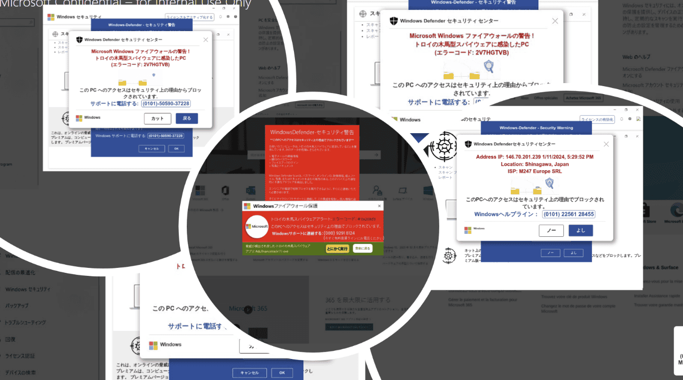 通报显示,诈骗团伙通过伪造微软安全警报弹窗(日文版),诱导受害者联系诈骗团伙提供的假冒技术服务热线(即上述非法呼叫中心)。