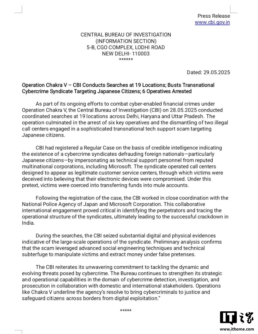 通报显示,三方于 5 月 28 日突击搜查了印度境内 19 处地点,逮捕 6 名核心嫌疑人并取缔两家非法呼叫中心。此次行动目标为利用 AI 技术针对日本老年人实施技术支持诈骗的犯罪网络。