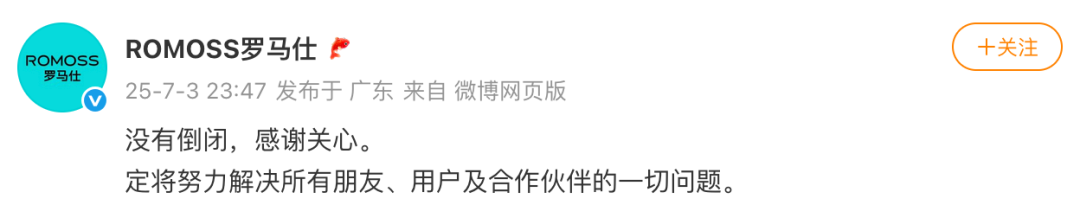 对此,7月3日晚间,深圳罗马仕科技有限公司官方微博发文回应“倒闭”传闻:没有倒闭,感谢关心。定将努力解决所有朋友、用户及合作伙伴的一切问题。