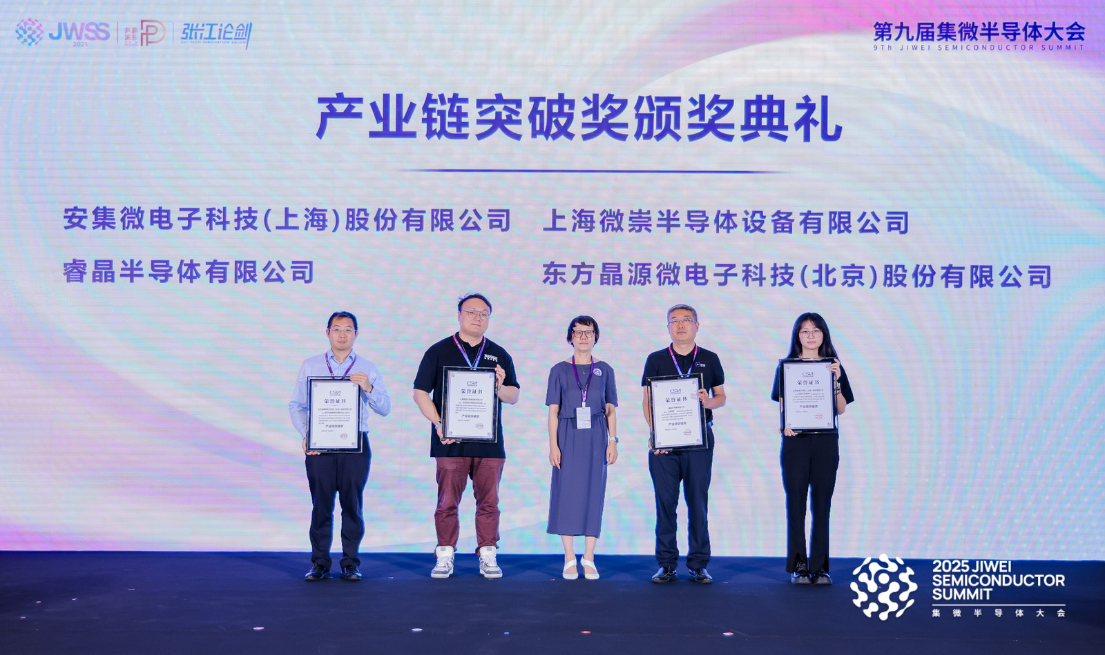 “主旨演讲+圆桌讨论+颁奖典礼+闭门午宴”的办会形式,令第三届集微半导体制造峰会极为吸睛。会议期间,为表彰过去一年在设备、材料及半导体制造上下游各环节实现技术突破,成功解决关键技术难题,推动产业链自主可控发展的优秀企业,经半导体投资联盟成员单位在内的评委会审议,安集微电子(高端半导体材料) 、睿晶半导体(光掩模版)、微崇半导体(全自动超声波缺陷检测设备)、东方晶源(电子束缺陷复检设备SEpA-r655)一举摘得“产业链突破奖”!