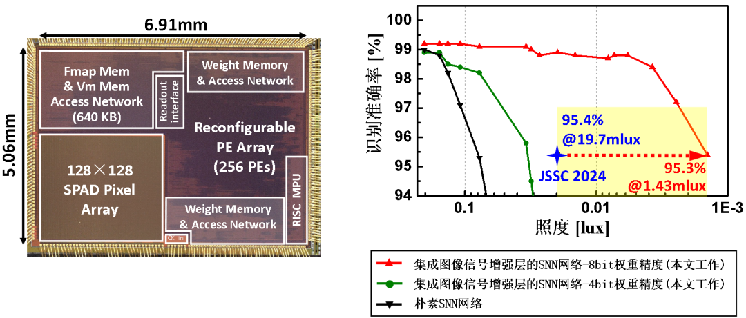 中国科学院半导体研究所刘力源研究员带领团队在超高速仿生片上视觉系统电路设计领域取得重要进展。团队创新性地设计了一款集成了单光子脉冲型图像传感器和脉冲神经网络处理器的超高速仿生脉冲片上视觉系统(图1),单光子雪崩二极管像素(SPAD)阵列天然地生成高速脉冲型图像信号,端到端的脉冲神经网络完成图像信号增强和智能图像识别任务,成功地实现了仿人类视觉系统的全脉冲型图像获取、传输、处理的功能。