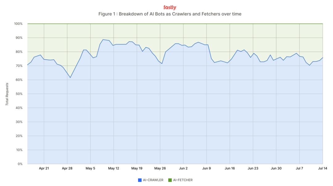 数据上看,爬虫机器人占了 AI 机器人请求量的近 80%,抓取机器人占剩下的 20%。