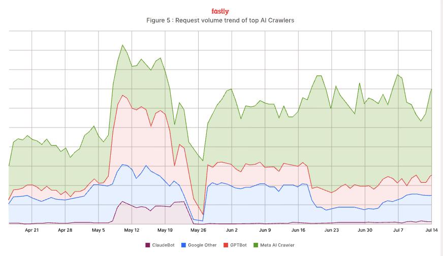 再来看一看 AI 爬虫的流量趋势。数据显示,近几个月以来,Meta 的爬虫明显在慢慢“加速”。
