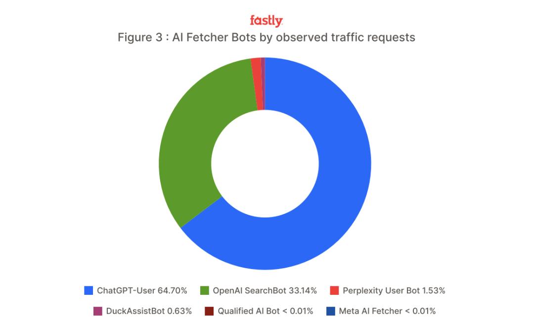 数据显示,几乎所有抓取请求里,ChatGPT-User 和 OpenAI SearchBot 共计占 98%,也就是说 OpenAI 主要靠 ChatGPT,对网站带来的抓取流量影响最大。其次,Perplexity 的抓取请求量只有 1.53%,不过它的影响力在慢慢上升。