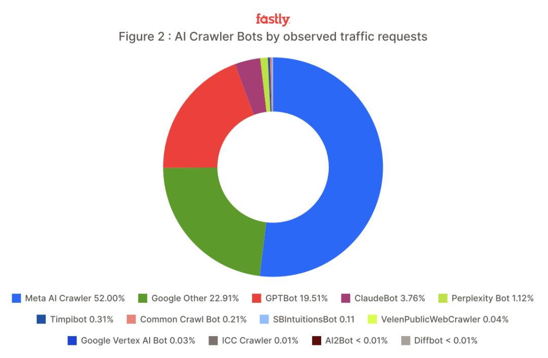 报告显示,AI 爬虫流量几乎全部被几家公司瓜分:Meta、Google 和 OpenAI 三家加起来就已经占了 95%,其中 Meta 占 52%,Google 23%,OpenAI 20%。