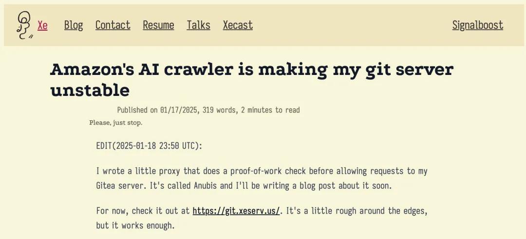 忍无可忍的 Xe Iaso 自己开发了一套叫“Anubis” 的系统( https://git.xeserv.us/ )。