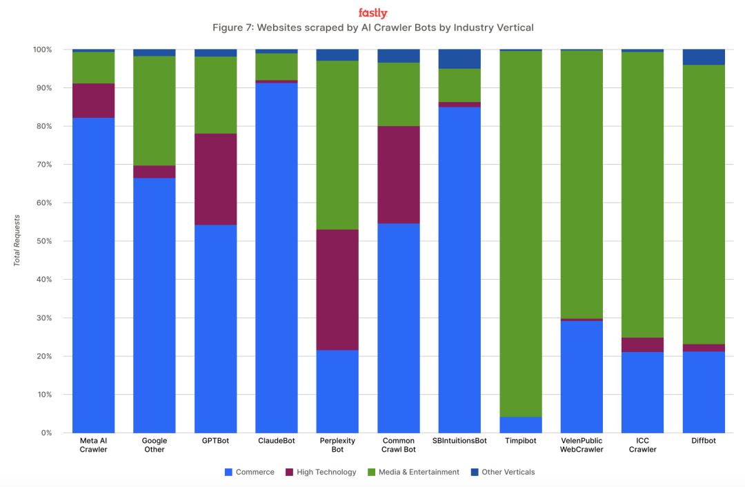 报告进一步指出,排名前四的爬虫公司——Meta、Google、OpenAI 和 Claude——似乎对商业网站特别感兴趣,总爱“盯着”这类内容。