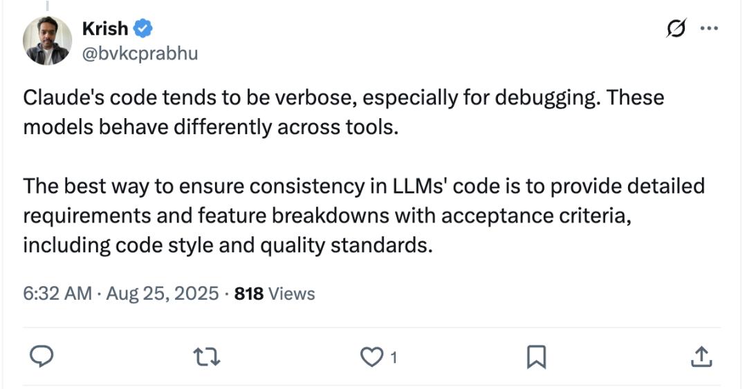 其他网友也是晒出了自己的心得:确保LLM生成代码一致性的最好方法是提供详细的需求说明和功能拆解,同时附上验收标准,包括代码风格和质量规范。