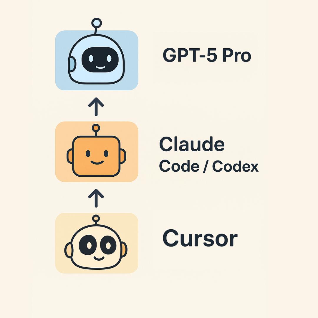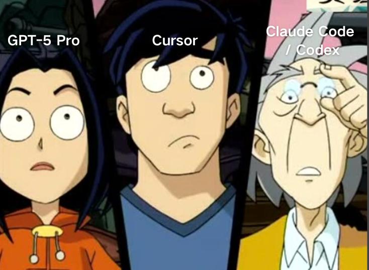 将常见、简单、局部的补全与修改交给Cursor,将较大功能块的实现交给Claude Code / Codex,当遇到它们都无法解决的问题,再求助GPT-5 Pro。