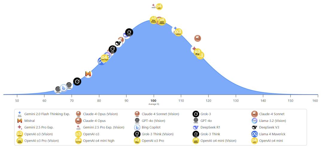 2025年之前的主流模型,如GPT-3.5、GPT-4o、Grok-3、Llama 3、Mistral、智谱AI的GLM-4等,其智商均低于100,也就是人类的平均水平。所以当我们使用这些模型,以及基于这些模型开发的AI应用的时候,我们会感觉这些产品「有点笨」,还不能很好地满足我们的需求。但是2024年底特别是2025年以来发布的模型,如OpenAI o3、Gemini 2.0、Gemini 2.5 Pro、Claude 4、DeepSeek R1等,其智商水平已经超过了人类平均水平100,从实际表现看,不少模型已经来到了110以上的区间。