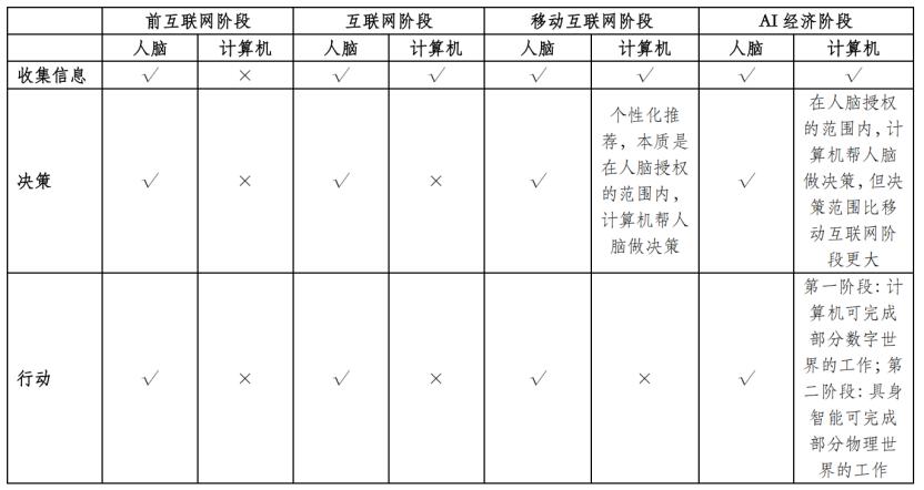 在「收集信息-决策-行动」链条中,在过去,由于决策主要是由人来做,行动是由人和人所控制的工具/机器来做,如果没有人的参与,经济活动是无法完成的。在AI经济中,以上三个步骤都可以由计算机完成,先在纯数字世界,之后拓展到物理世界。这个经济系统可以自动运行,直到把工作做完。
