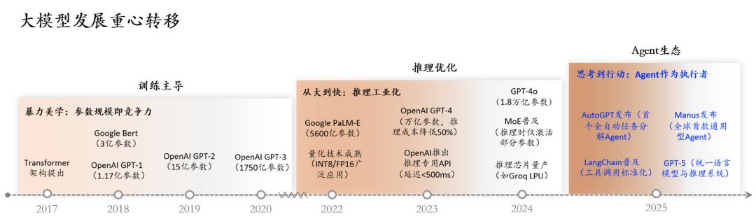 自2017年Transformer架构提出至今,大模型发展的重心也在不断发生转移,起始阶段是大模型的训练主导,核心目标在于通过扩大参数量和数据规模提升模型能力。之后大模型落地应用面临成本与效率瓶颈,推理专用芯片、MoE等与推理强相关的技术逐渐普及。Agent的出现推动了AI技术从单一任务执行向复杂决策与交互的转变,成为了AI应用最具想象力的板块。