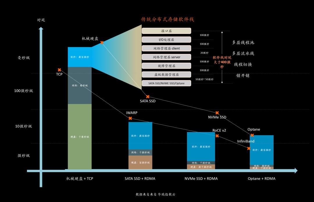 存储设备硬件访问延迟以及网络访问时延均已降至十微秒,但传统的系统软件栈开销仍然在百微秒级别——硬件性能提升被传统存储软件架构的低效率所吞噬,导致数据洪流阻塞(如GPU直接访问存储的路径冗余)和算力闲置(GPU等待数据搬运的时间远超计算时间,RDMA网络优势因软件协议栈无法充分发挥)等矛盾。