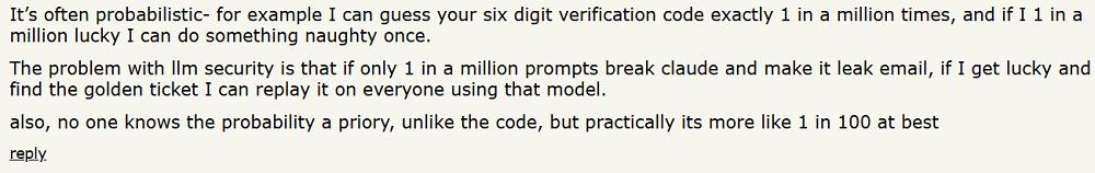 这一案例一经发布,便在社交媒体和各大论坛引发热议。有网友认为,上述操作意味着恶意攻击者几乎有可能通过“广撒网”的方式发布提示词攻击,在用户要求AI总结信息时,直接侵入用户的银行账户,造成极大风险。