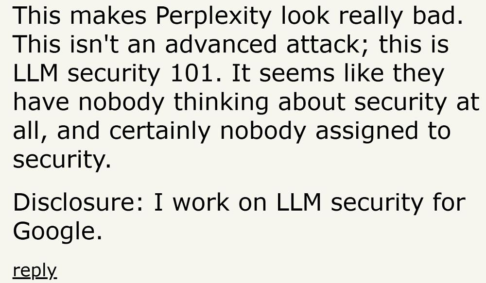 还有一名在谷歌工作的大模型安全工程师下场吐槽,称此类攻击“并不高级”,而是大模型安全第一课中就应该防范的攻击类型,看上去Perplexity完全没有考虑到这一安全问题,更别提派人解决了。