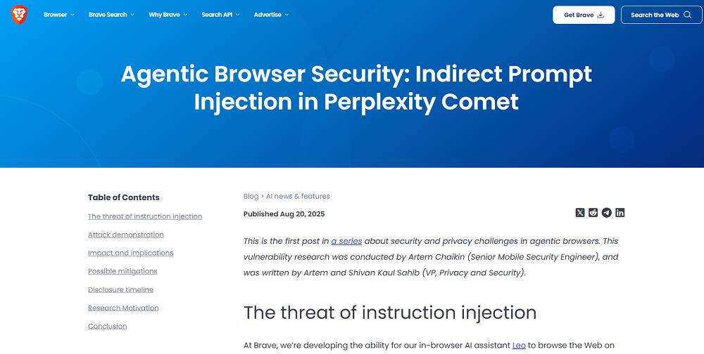智东西8月26日报道,近日,美国浏览器公司Brave发布博客,称该公司在美国知名AI搜索独角兽Perplexity打造的AI浏览器Comet中发现了一个严重安全漏洞,攻击者可通过在网页中发布恶意指令,来操纵AI浏览器登录网站、访问邮箱、获取验证码,并将这些敏感信息发送给外部攻击者。全程耗时两分半,连普通人也能完成这种攻击。