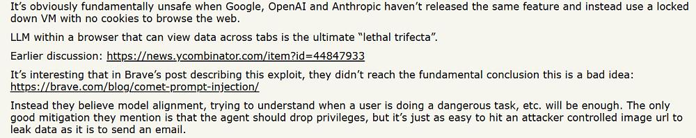有网友分析道,谷歌、OpenAI、Anthropic等企业都没有发布与Comet类似的功能,而是使用没有cookie的虚拟机来浏览网页。这说明这些企业已经意识到了这种行为的风险。