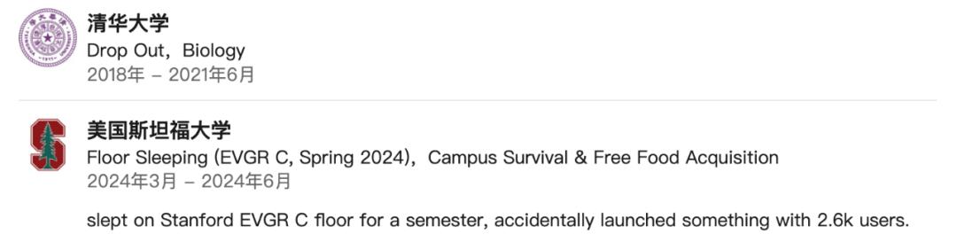 值得关注的是,他曾凭借生物奥赛金牌进入清华大学(学习生物),研究方向包括 DNA 折纸,并曾担任 2019 年 iGEM 团队的负责人。不过,他从清华肄业。