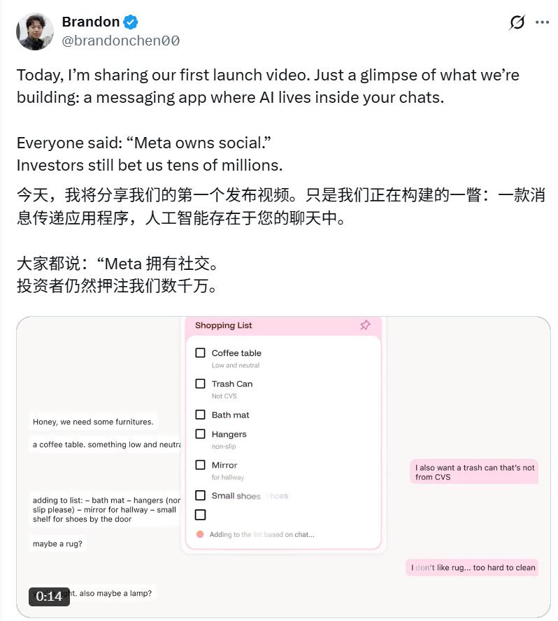 几个示例看下来,这款社交应用应该是把微信那种聊天功能以及大模型的自动执行功能结合起来了。如果你也想体验一下这种最新聊天方式,可以申请: