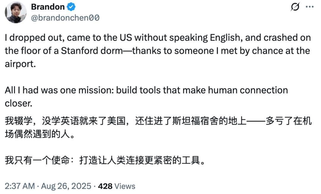 小哥名叫 Brandon Chen,小小年纪经历不少,清华辍学,生物学专业却跨行搞起了社交软件开发,不懂英语却敢只身一人来到美国闯荡,还在斯坦福睡了一个学期的地板。至于为啥睡地板,Brandon 也没说原因。