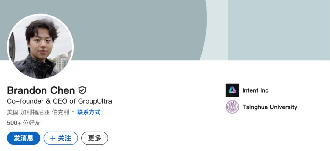 根据领英资料显示,Brandon Chen 自 2022 年 9 月共同创立了 Intent Inc.,并担任 CEO,旨在打造面向群体协作的 AI 原生产品,包括 atmealtime.com(2024)、riffo.ai(2024)和 moobius.ai(2023)。