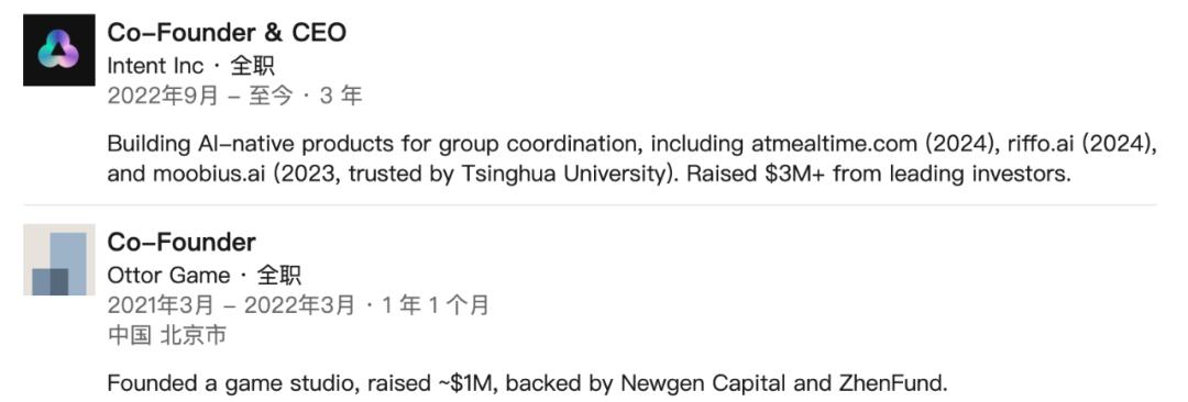 在成立 Intent 之前,他还是 Ottor Game(一家游戏工作室,融资约 100 万美元,并获得了 Newgen Capital 和真格基金的支持)的联合创始人。