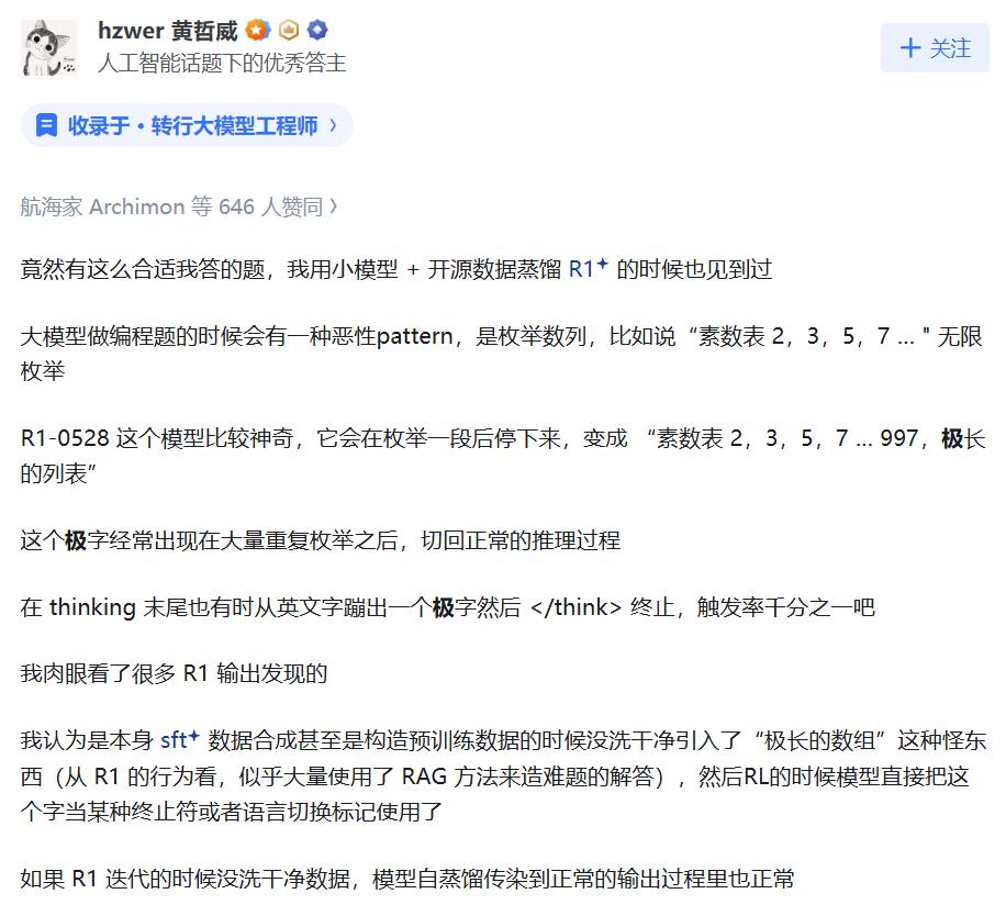 比如阶跃星辰黄哲威表示:「我认为是本身 sft 数据合成甚至是构造预训练数据的时候没洗干净引入了 “极长的数组” 这种怪东西(从 R1 的行为看,似乎大量使用了 RAG 方法来造难题的解答),然后 RL 的时候模型直接把这个字当某种终止符或者语言切换标记使用了。」