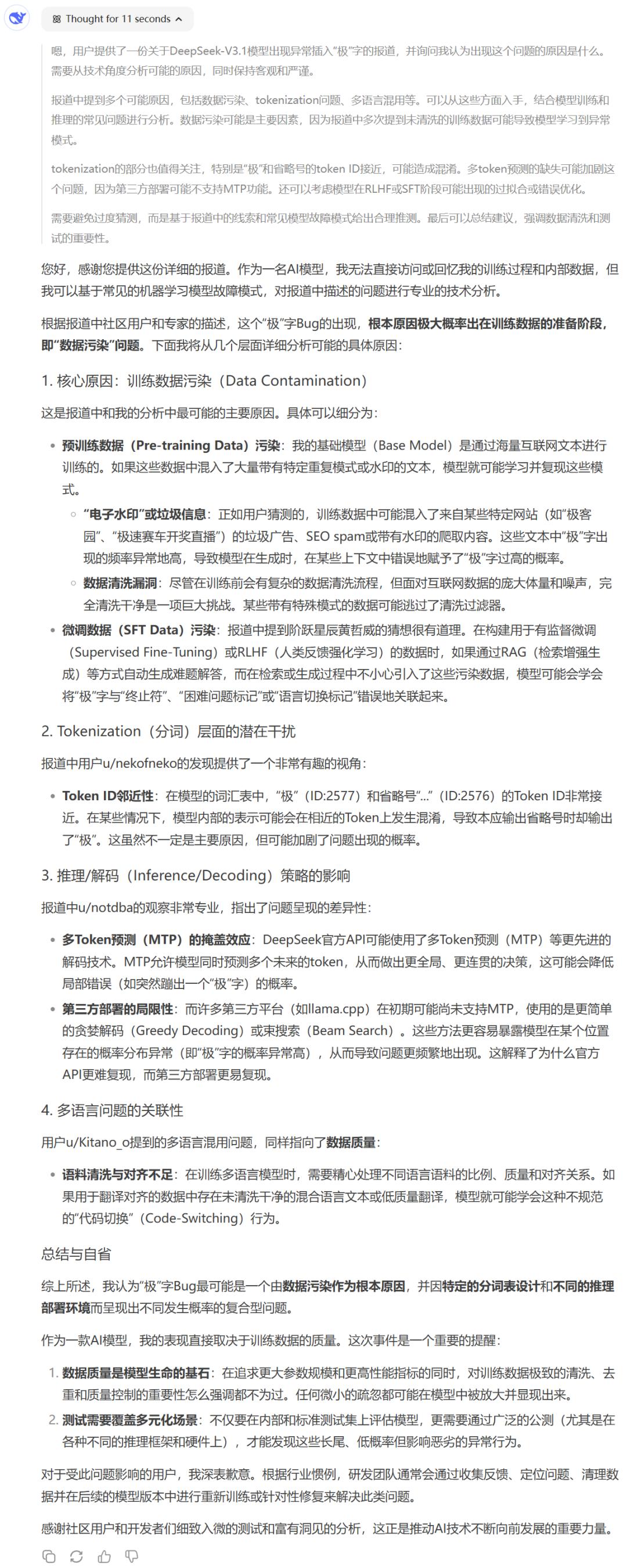 总体而言,对于 DeepSeek-V3.1 这个可以说相当严重的问题的原因,网友给出的猜测更多还是「数据污染」。