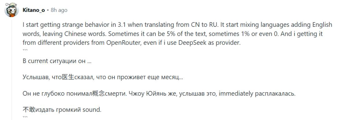 还不只是「极」,也有用户发现 DeepSeek-V3.1 还存在多语言混用的问题,u/Kitano_o 分享说:「我使用 3.1 从中文翻译成俄语时,遇到一些奇怪的行为。它开始混合多种语言 —— 添加英文词,也留下些中文词。有时这些问题会占到文本的 5%,有时只占 1%,甚至 0%。而且使用 OpenRouter 的不同提供商都会出现这个问题,即使我使用 DeepSeek 作为提供商也会。」
